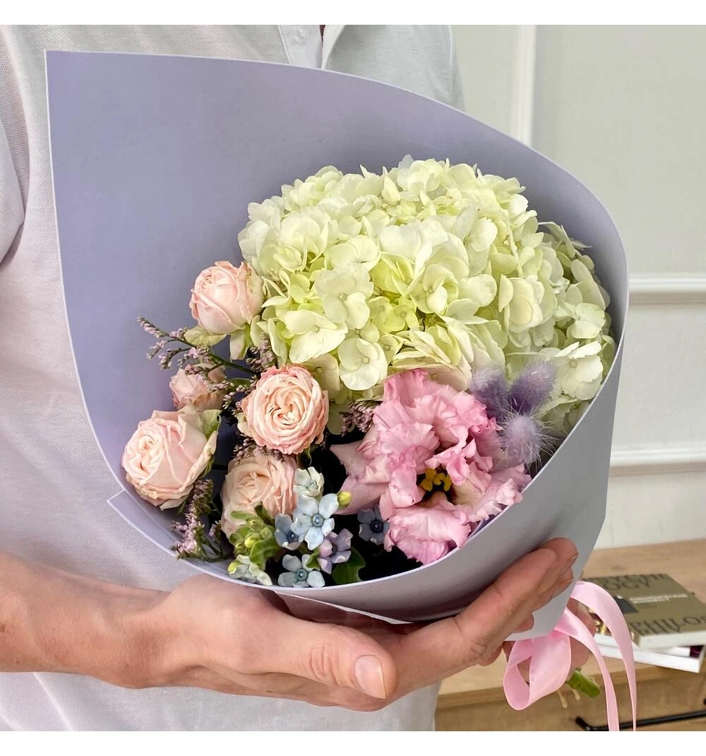 Это восхитительное сочетание прекрасной гортензии и изящной кустовой розы, создающее утонченный и элегантный образ. Гортензии приносят нотки изобилия и нежности, в то время как кустовая роза добавляет роскоши и красоты. Этот уникальный букет станет особенным подарком для выражения нежных чувств и привнесения радости в жизнь вашего получателя.