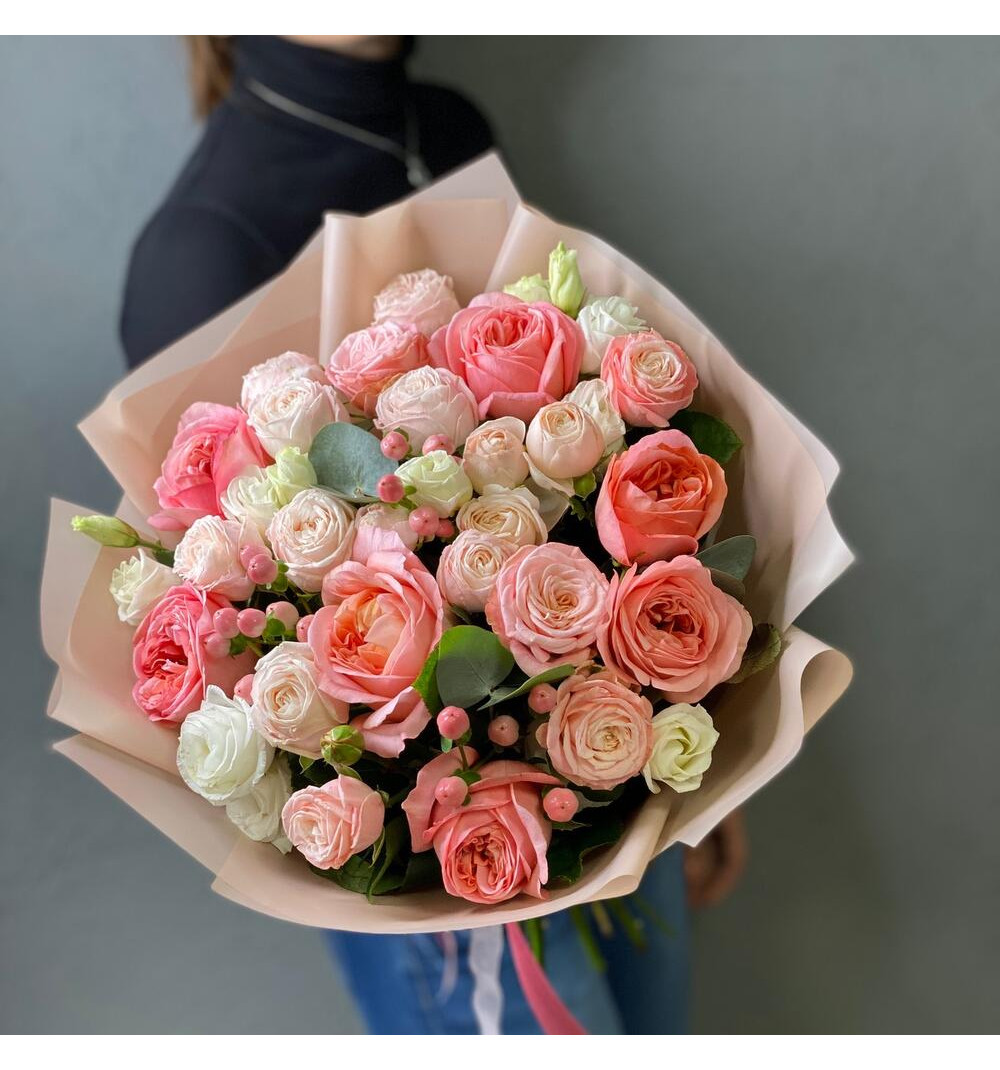 Волшебный букет из пионовидных роз — это гармоничное сочетание красоты и элегантности. Нежные оттенки роз создают романтическую атмосферу, а гиперикум и эвкалипт добавляют утонченности и свежести. Каждый цветок внимательно отобран, чтобы создать изящную и стильную композицию. Этот уникальный букет станет великолепным подарком для особенных моментов и событий, чтобы выразить любовь, уважение или благодарность вашим близким. Он приносит в себе нежность и красоту, чтобы сделать день вашего получателя незабываемым и особенным.
