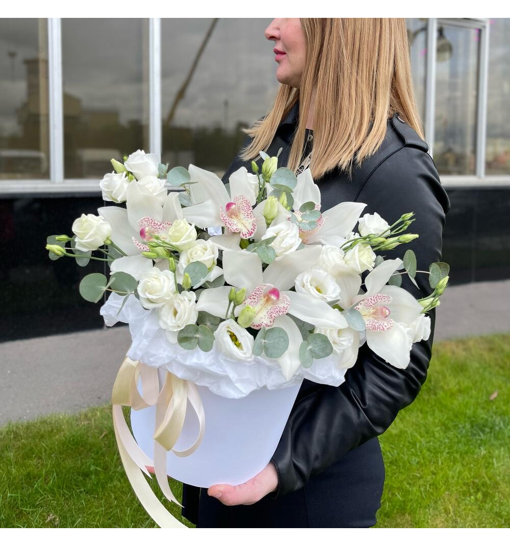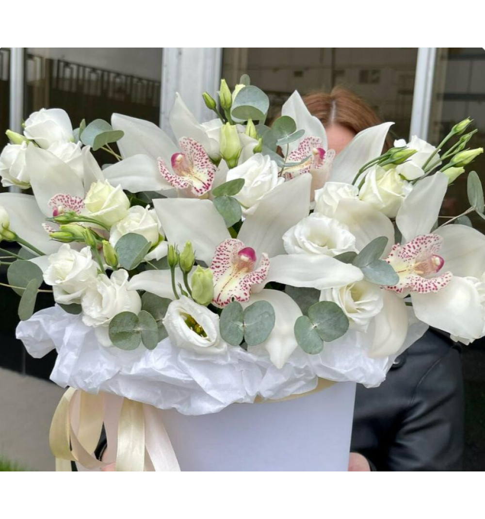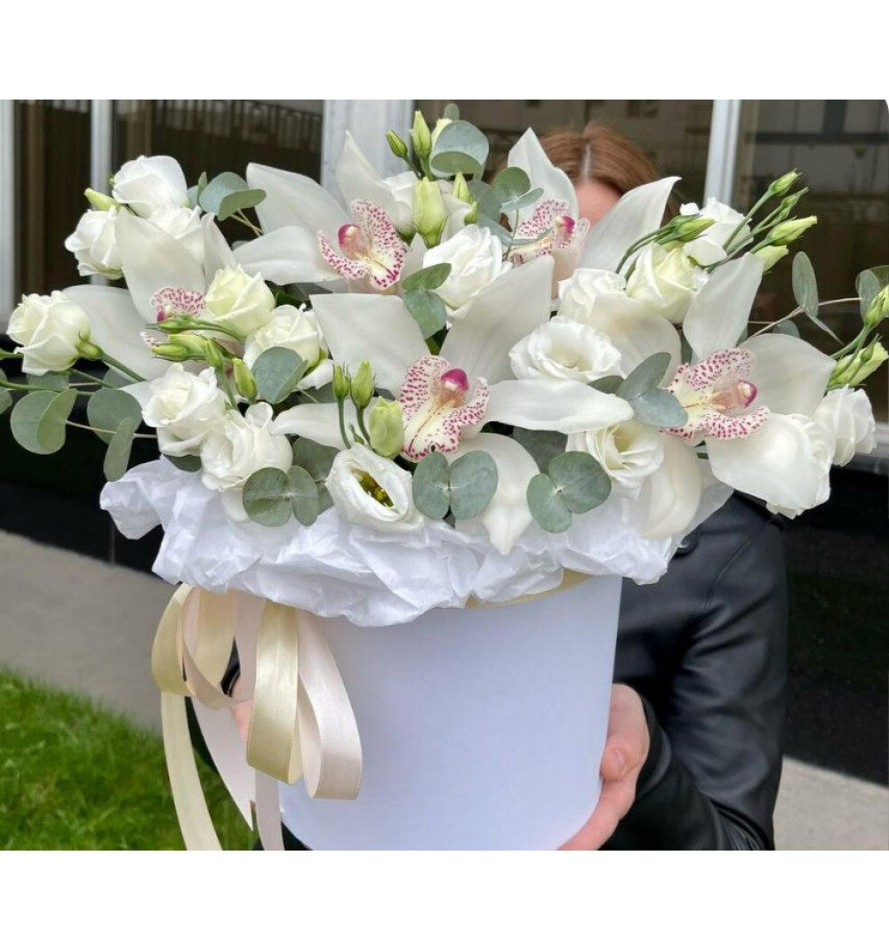 Купить Орхидея белая с эустомой в коробочке в Кокшетау за 25 000 ₸ | интернет-магазин «Guls»